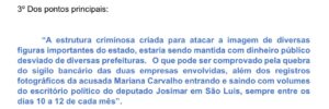 Segundo os relatos, os recursos provenientes desses contratos estariam sendo repassados mensalmente a Mariana Carvalho na capital São Luís, sempre entre os dias 10 e 12 de cada mês. Essa estrutura, de acordo com a denúncia, financiaria a atuação digital de militantes pagos para atacar adversários políticos e defender os interesses de Josimar e seus aliados entre eles o vice governador Felipe Camarão.